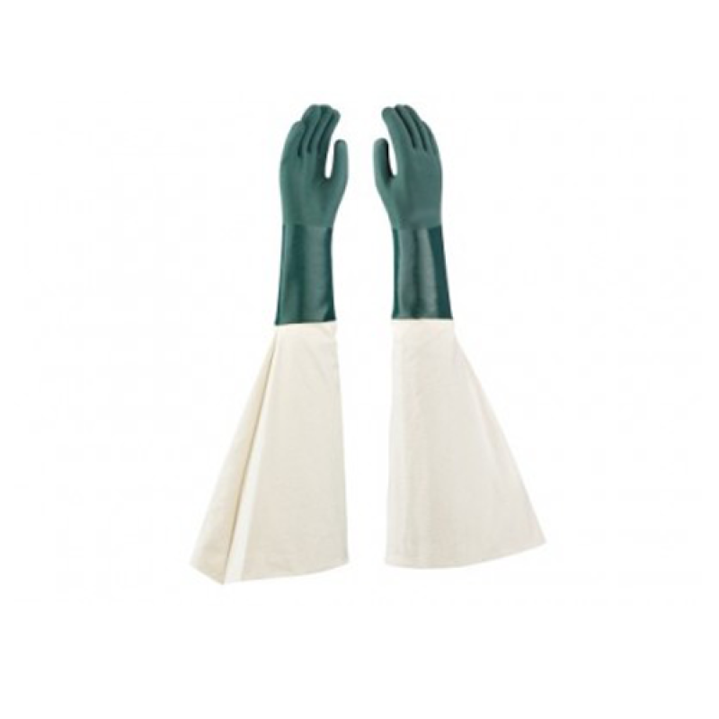 textura antiderrapante na face palmar e dorso , possui cano em lona para acoplar em equipamento de jato de areia.