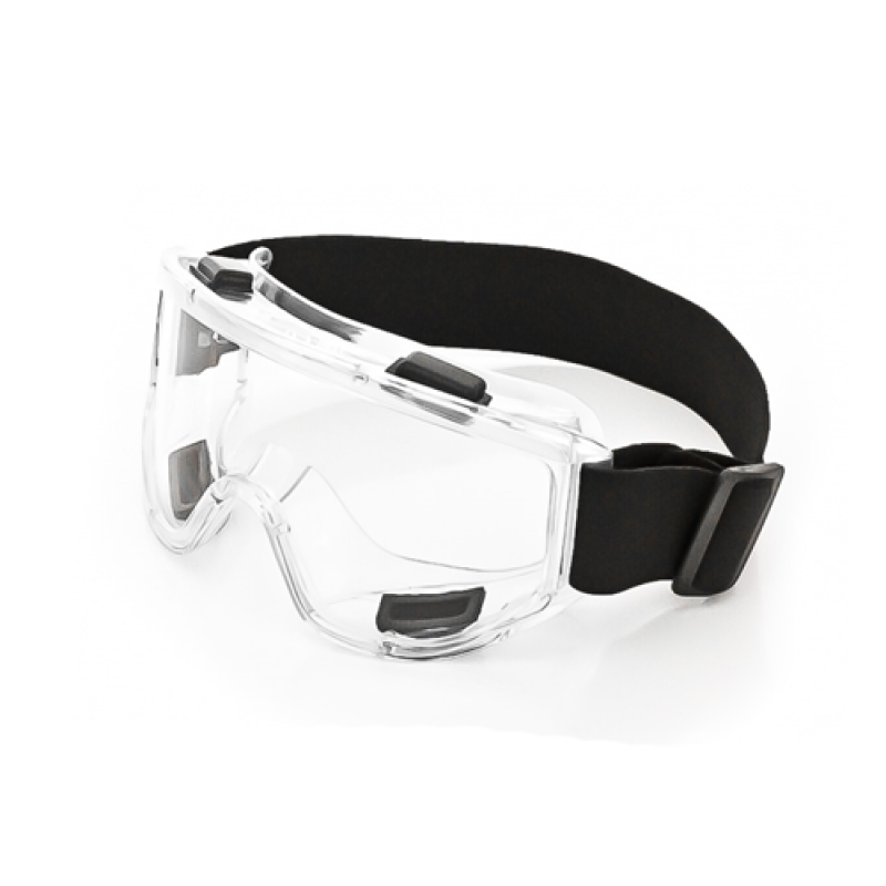 Óculos de segurança modelo ampla visão constituído de armação confeccionada em uma única peça de PVC flexível transparente com sistema de ventilação indireta composto por quatro válvulas, sendo duas na parte superior e duas na parte inferior da armação, visor de policarbonato incolor, tirante elástico para ajuste. O modelo cobre toda a região em torno dos olhos do usuário.
