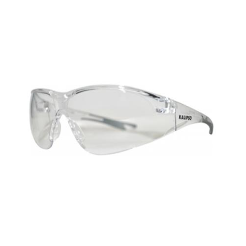 Óculos de segurança com armação e visor confeccionados em uma única peça de policarbonato, ponte e seis pinos na altura do nariz para o encaixe de borracha termoplástica maleável em forma de “V” para apoio nasal, hastes tipo espátula fixadas ao visor através de parafuso metálico confeccionadas do mesmo material da armação com revestimento de borracha termoplástica nas extremidades.
