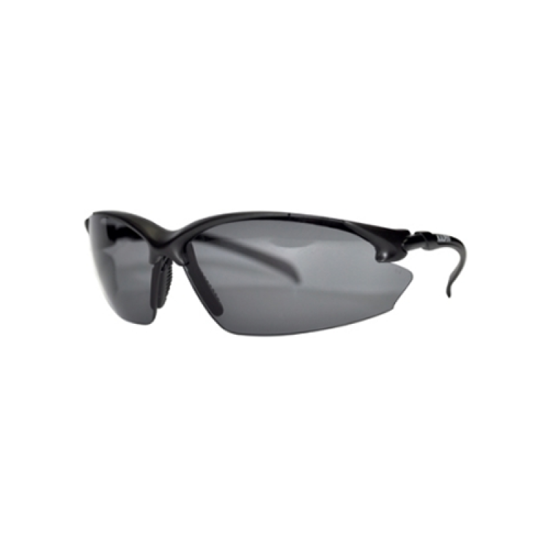 Óculos de segurança constituídos de arco de material plástico (náilon) com canaleta dividido em duas partes pela ponte, onde estas partes suportam lentes confeccionadas em policarbonato, encaixadas nas canaletas do arco, apoio nasal com plaquetas de borracha PVC encaixadas em dois pinos de plástico, hastes tipo espátula confeccionadas do mesmo material do arco e fixadas ao arco por meio de parafuso metálico.