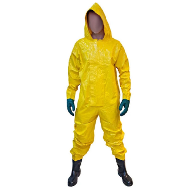 Macacão de segurança para saneamento, confeccionado em tecido sintético plastificado com PVC em ambas as faces (trevira), Costuras por meio de solda eletrônica, com capuz, fechamento frontal através de zíper e botões de pressão, acoplado com luva de PVC e bota de PVC.